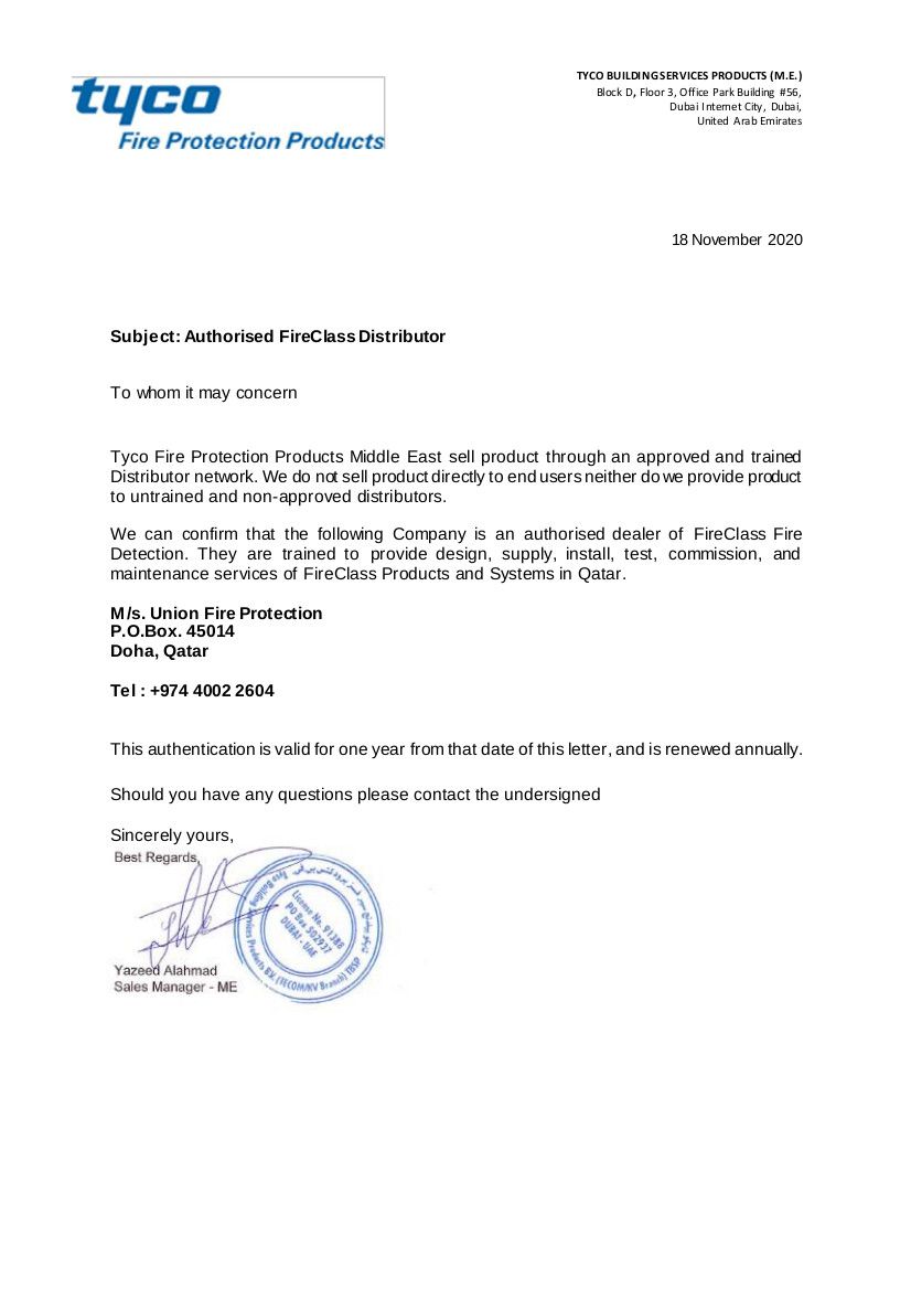 Tyco Authorized Union Fire Protection as a Trained dealer for Qatar to provide design, supply, install, test, commission, and maintenance services of Fireclass Products and Systems.